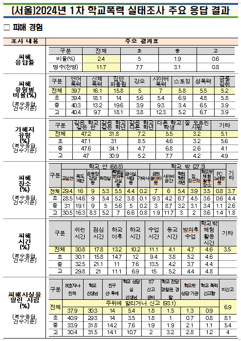 서울시교육청, 2024년 1차 학교폭력 실태조사 결과...‘언어폭력’이 가장 많아