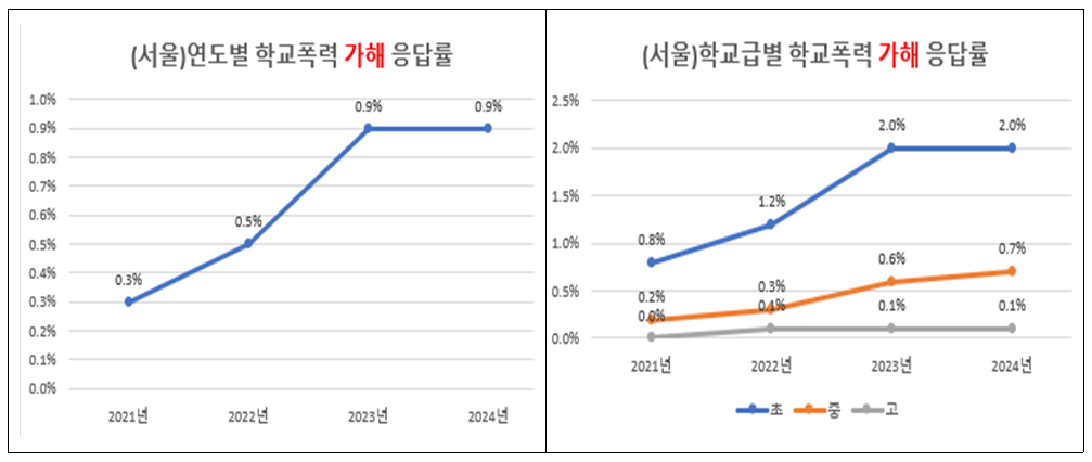 가해응답률은 0.9%로 전년과 동일한 수치를 유지했다. 학교급별로는 초등학교와 고등학교에서 변동이 없었고, 중학교에서만 0.1%p 증가했다. 가해 학생의 유형은 ‘같은 반 학생’이 47.2%로 가장 많았으며, ‘다른 반 학생’(31.8%), ‘다른 학년 학생’(7.2%)이 그 뒤를 이었다.