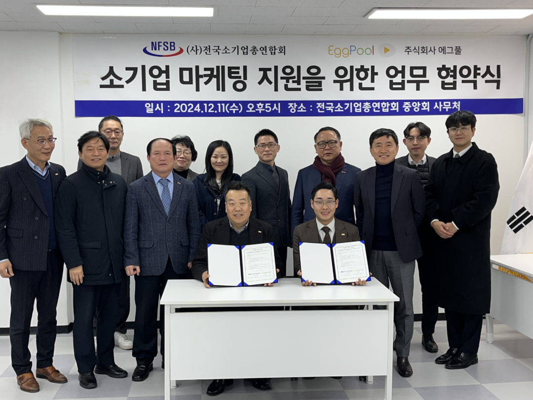 전국소기업총연합회 권혁환 수석부회장과 주식회사 에그풀 심효준 대표는 11일 오후 전국소기업총연합회 사무실에서 전국소기업총연합회와 상호협력과 소기업 마케팅 지원을 통한 회원사의 발전을 위한 업무협약(MOU)을 체결했다고 밝혔다.