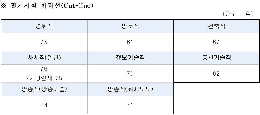 직렬별 필기 합격선은 △경위직 75점 △사서직(일반) 76점(지방인재 75점) △방호직 61점 △건축직 67점 △정보기술직 70점 △통신기술직 62점 △방송직(방송기술) 44점 △방송직(취재보도) 71점으로 확정됐다.