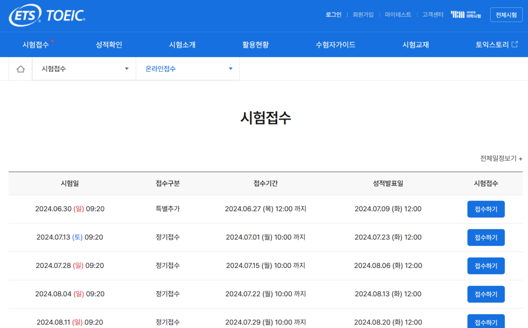 현재, 6월 30일(일), 7월 13일(토), 28일(일), 8월 4일(일), 11일(일) 토익 시험이 접수 중에 있다.