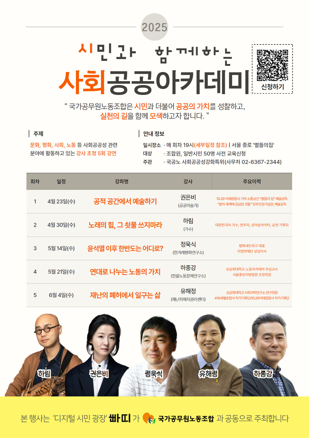 총 6회에 걸친 강연 시리즈는 공공성, 문화, 안전, 사회적 책임 등 각기 다른 주제를 중심으로 분야별 전문가 및 예술인이 강사로 나선다. 구체적인 강연 일정과 연사 소개는 국공노 누리집과 ‘보이는 국공노’ 채널을 통해 추후 안내된다.