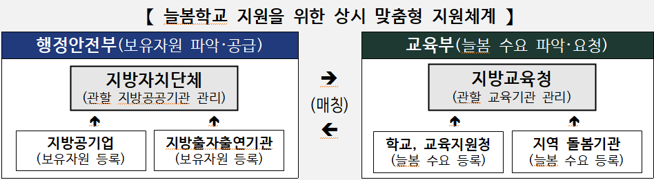 지방공공기관에는 '늘봄지원관'을, 행정안전부에는 '늘봄지원 총괄담당관'을 지정하여 교육기관이 지방공공기관의 시설 등 자원에 대한 사용을 직접 협의할 수 있도록 소통 기반을 마련할 예정이다.