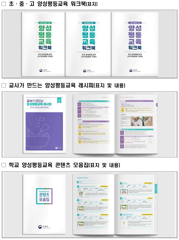 이번에 발간된 교수학습자료는 총 5종으로, ① 「초등학생을 위한 양성평등교육 워크북」 ② 「중학생을 위한 양성평등교육 워크북」 ③ 「고등학생을 위한 양성평등교육 워크북」 ④ 「교사가 만드는 양성평등교육 레시피」 ⑤ 「학교양성평등교육 콘텐츠 모음집」으로 구성됐다.