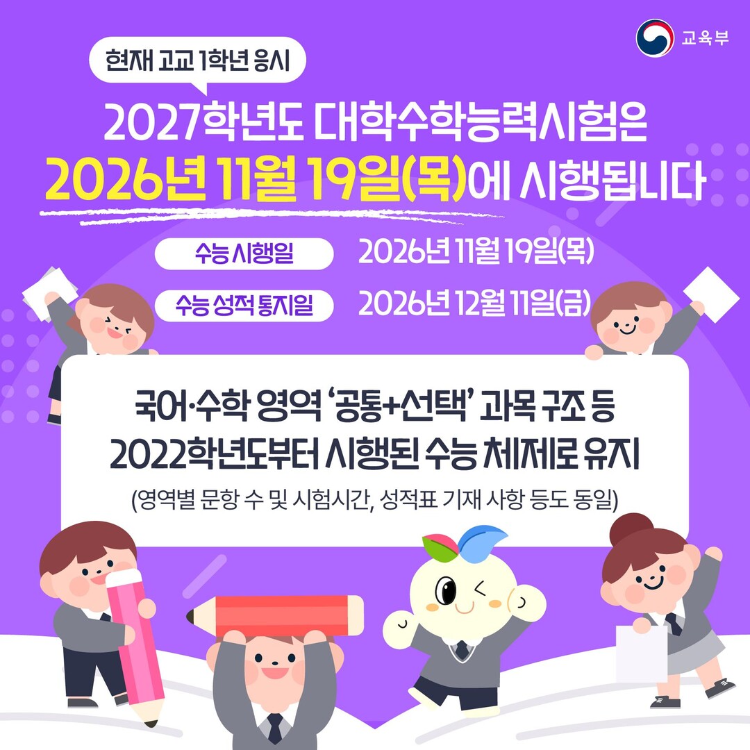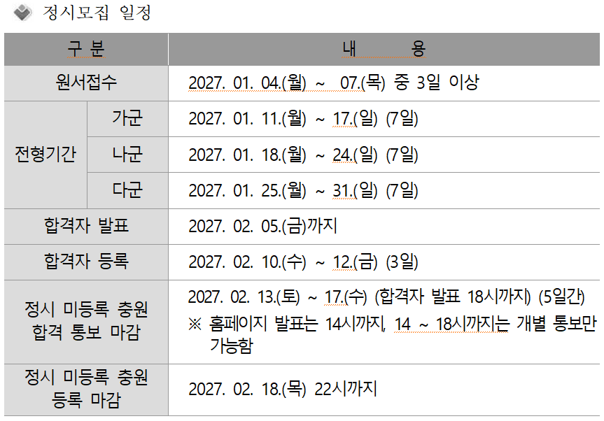 한편, 2027학년도 대입 전형 수시모집 원서접수는 2026년 9월 7일(월)부터 11일(금) 사이 3일 이상 진행된다.
