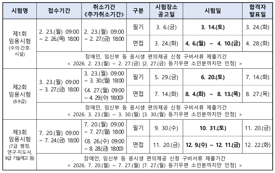 2026년도 지방공무원 임용시험은 총 3회로 치러진다. 제1회 임용시험은 의무·수의 등 일부 직렬을 대상으로 한 경력경쟁 방식으로 진행되며, 3월 14일 필기시험을 실시한다. 이후 4월 6일부터 10일까지 면접시험을 거쳐 4월 28일 최종합격자를 발표한다.