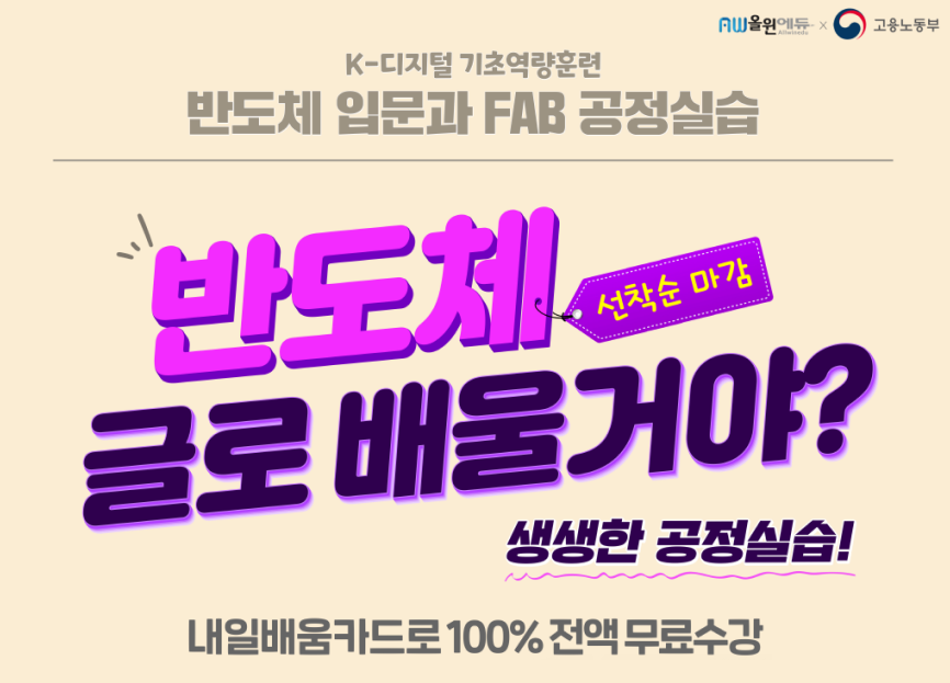 올윈에듀와 연세대가 함께 제작한 ‘반도체 입문과 FAB 공정실습’ 온라인(1개월) 과정은, 반도체 및 전기전자 분야의 취업을 희망하는 대학생 및 구직자 맞춤형으로 제작된 고용노동부 ‘K-디지털 기초역량훈련’ 과정이다. 대학교 재학기간에 접하기 다소 어려운 반도체 FAB 공정 실무를 온라인 체험 실습 형태로 구성하여, 반도체 취업 사전직무 실질역량강화에 초점을 두었다.