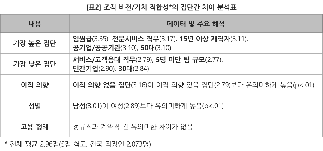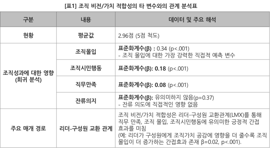조직의 비전·가치에 공감하는 정도(비전/가치 적합성)가 높을수록 조직몰입, 직무만족, 조직시민행동 등이 유의미하게 증가했다.