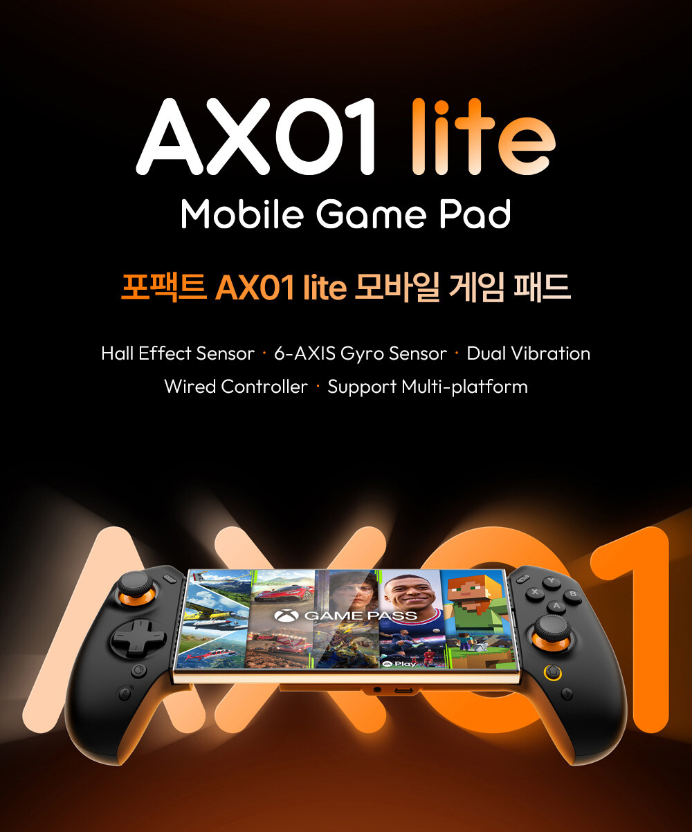 포팩트는 AX01 lite에 게이머가 필요로 하는 기본 성능을 빠짐없이 담았다. 홀 이펙트 스틱과 홀 리니어 센서 트리거를 적용해 입력 정확도를 높였고, 최대 216㎜까지 확장되는 구조로 다양한 기기와의 호환성을 확보했다. 좌우 비대칭 진동 모터와 6축 자이로 센서는 반응성을 강화하는 요소로 더해졌다. 장시간 플레이를 고려한 터보·오토 기능과 패스스루 충전 기능도 지원한다.