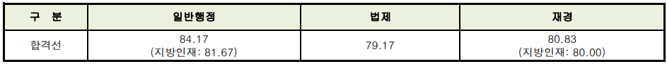 일반행정직 합격선은 84.17점으로 전년(80.83점) 대비 3.34점 올랐고, 법제직은 지난해 70.83점보다 무려 8.34점이나 상승한 79.17점을 기록했다. 또 재경직은 전년(79.17점)도 보다 1.66점 오른 80.83점이다.