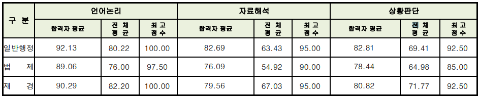 PSAT 과목별 합격자 평균 점수는 ▲언어논리-일반행정 92.13점, 법제 89.06점, 재경 90.29점 ▲자료해석-일반행정 82.69점, 법제 76.09점, 재경 79.56점 ▲상황판단-일반행정 82.81점, 법제 78.44점, 재경 80.82점을 기록했다.