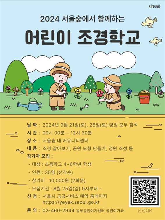 ‘제16회 어린이 조경학교’는 동부공원여가센터와 (재)환경나눔연구원이 공동 운영하며, 참여 학생 35명을 선착순 모집한다. 참가 신청은 서울시 공공서비스예약을 통해 가능하다.