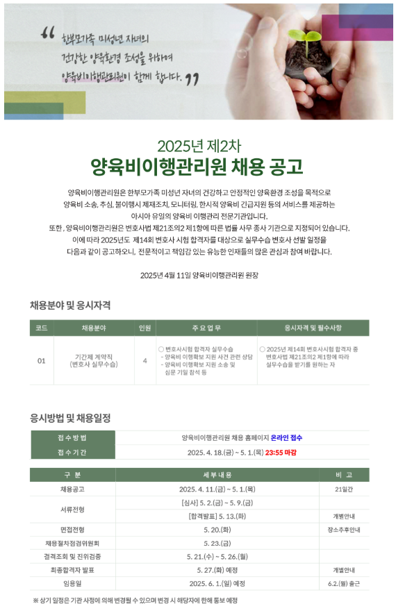 양육비이행관리원 채용 홈페이지에서 온라인 접수만 가능하며, 4월 18일(금) 접수 시작해 5월 1일(목) 밤 11시 55분에 마감된다.