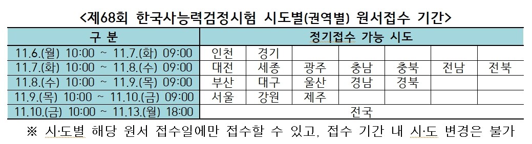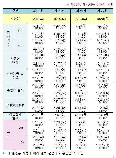 다음 68회 시험은 11월 6일부터 각 시도별로 기간에 맞게 원서 접수하고 12월 2일에 시험을 치른다. 추가 접수는 11월 17일부터 20일까지이며 시·도 상관없이 접수가 가능하다.