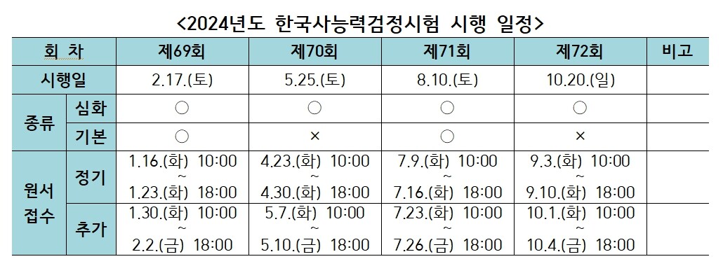 한편, 2024년도 한국사능력검정시험은 총 4회(심화 4회, 기본 2회) 시행하며, 70회와 72회는 심화만 실시하며, 특히 72회 시험은 토요근무자 등의 편의를 위해 일요일에 시행한다.