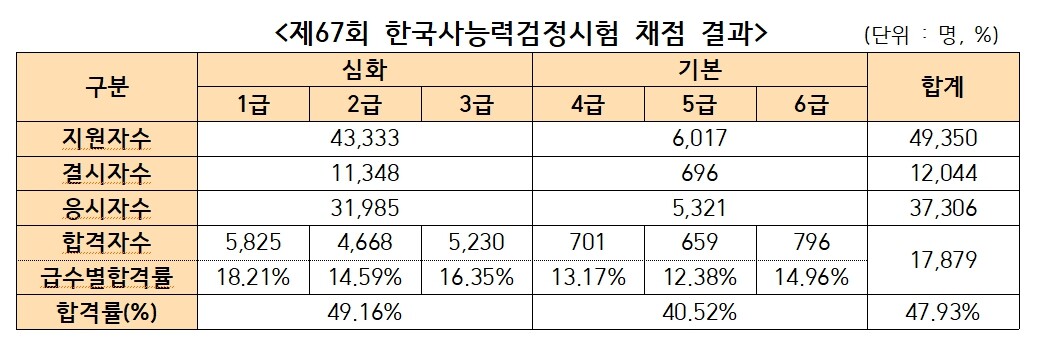 67회 한국사능력검정시험은 49,350명이 지원, 37,306명이 응시한 결과 17,879명이 합격했다. 평균합격률은 47.93%이고 결시율은 24.40%로 나타났다.