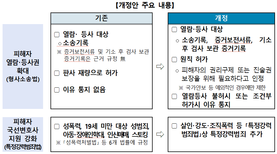 새롭게 통과된 형사소송법 개정안은 법원이 보관 중인 형사재판기록뿐 아니라, 증거보전 서류와 기소 후 검사가 보관하고 있는 증거기록까지 원칙적으로 피해자가 열람·등사할 수 있도록 허용하는 내용을 규정하고 있다.