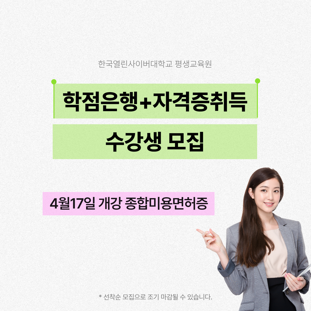 [피앤피뉴스=마성배 기자] 한국열린사이버대학교 평생교육원이 종합미용면허증 취득 과정을 1학기 6차로 4월 17일 개강할 예정이다. 본 과정은 헤어, 피부, 메이크업, 네일 등 미용 분야 전반을 체계적으로 학습할 수 있도록 구성되어 있으며 선착순 모집으로 진행되며, 정원 마감 시 조기 종료될 수 있다.