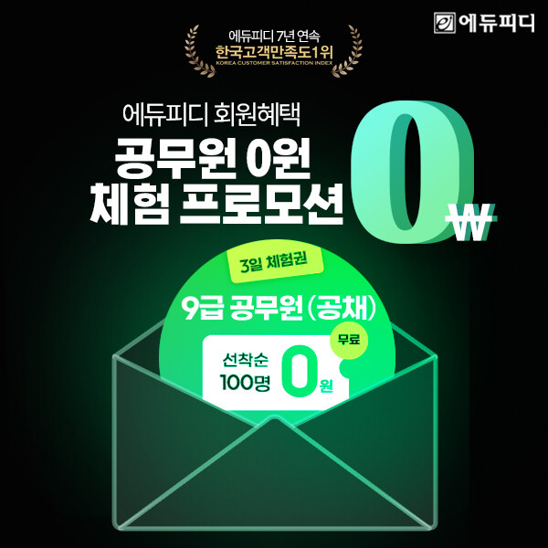 ‘0원 체험 프로모션’은 9급 일반행정직, 교육행정직, 교정직, 보건직, 사회복지직, 행정직(군무원)과 소방간부후보생 총 7개 직렬에 적용되며, 에듀피디 홈페이지 내 각 직렬별 수강페이지에 노출된 ‘3일 체험권 쿠폰’을 다운받아 전 과목 강좌를 3일 동안 무료로 수강할 수 있다.
