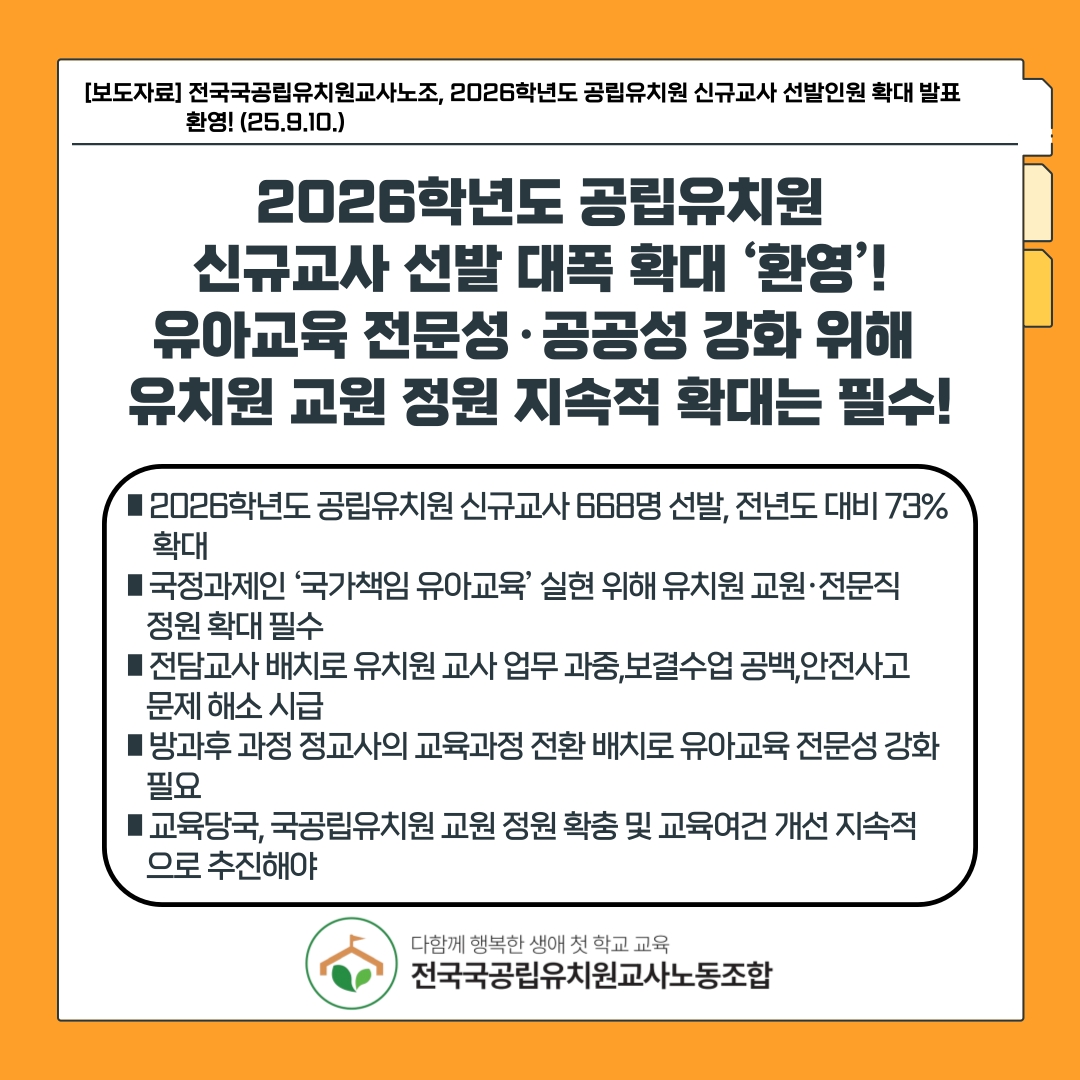 노조는 이번 교사 증원 발표를 계기로 교육부와 시·도교육청이 ▲국공립유치원 교원·전문직 정원 확충 ▲노후화된 유치원 시설 개선 ▲교권 보호를 위한 행·재정적 지원 강화 ▲유아교육과 보육의 명확한 역할 구분 등 근본적 개혁에 나서야 한다고 촉구했다.