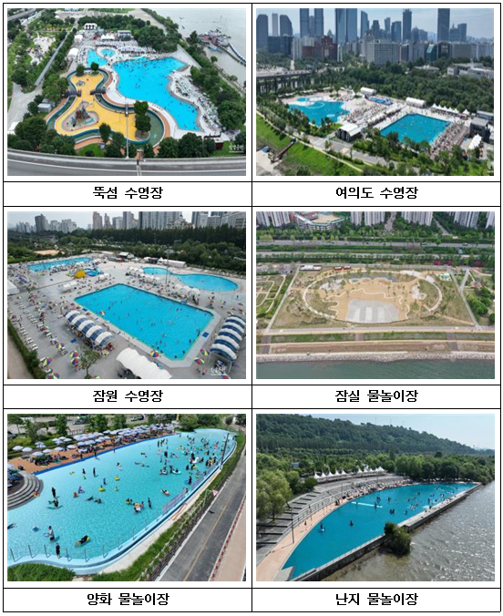 이번에 문을 여는 시설은 뚝섬·여의도·잠원 한강공원 내 수영장과 잠실·난지·양화 한강공원 내 물놀이장 총 6곳이다. 다만 망원 수영장은 ‘성산대교 북단 공사’로 인해, 광나루 수영장은 ‘자연형 물놀이장 조성공사’로 인해 올해는 개장하지 않는다.