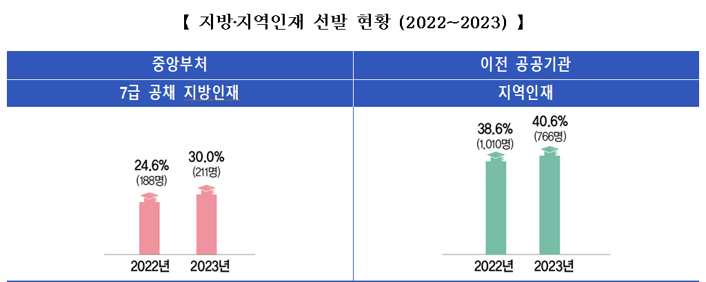 지방·지역인재 채용도 확대되고 있다. 중앙부처 7급 공채에서 지방인재 선발 비율은 전년 대비 5.4%p 상승한 30.0%로, 제도 도입 이후 처음으로 30% 목표를 달성했다.