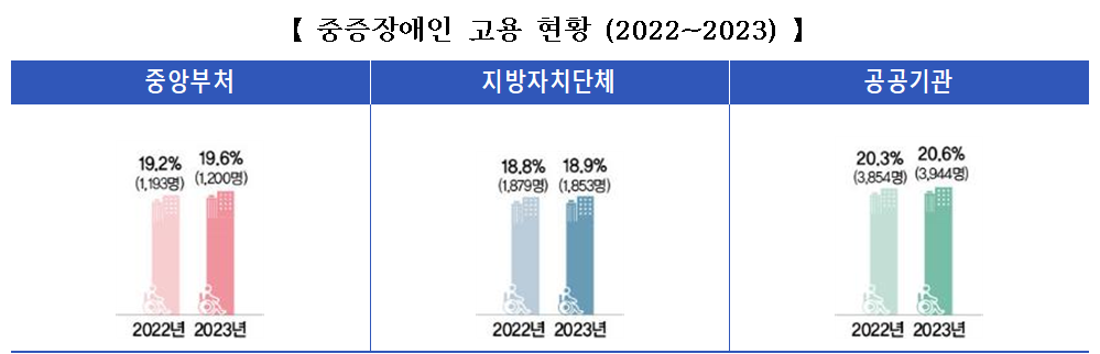 중증장애인 고용 비율도 꾸준히 증가하고 있는데, 중앙부처 장애인 공무원 중 19.6%, 지방자치단체는 18.9%, 공공기관에서는 20.6%가 중증장애인으로 나타나 전년 대비 증가 추세를 이어갔다.