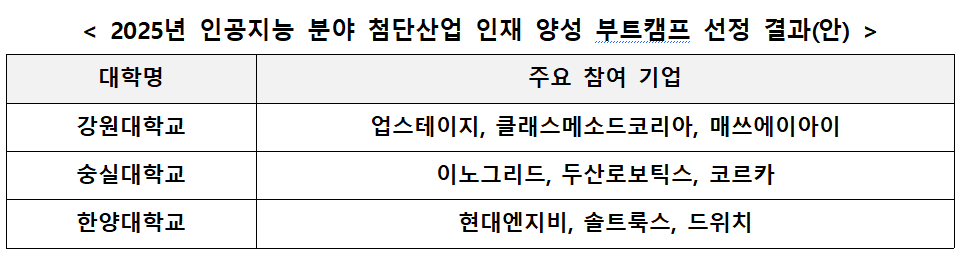 [피앤피뉴스=마성배 기자] 교육부와 한국산업기술진흥원은 9월 2일, 「2025년 인공지능(AI) 분야 첨단산업 인재 양성 부트캠프」 선정 결과를 발표했다.