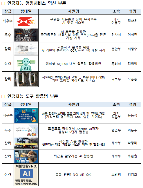 올해 인공지능 학습자원 공모전은 ‘행정서비스 혁신’과 ‘AI 도구 활용법’ 두 부문으로 구분해 수상자가 선정됐다. 인사처장상은 각 부문별 우수 기관과 연구자에게 전달됐다.