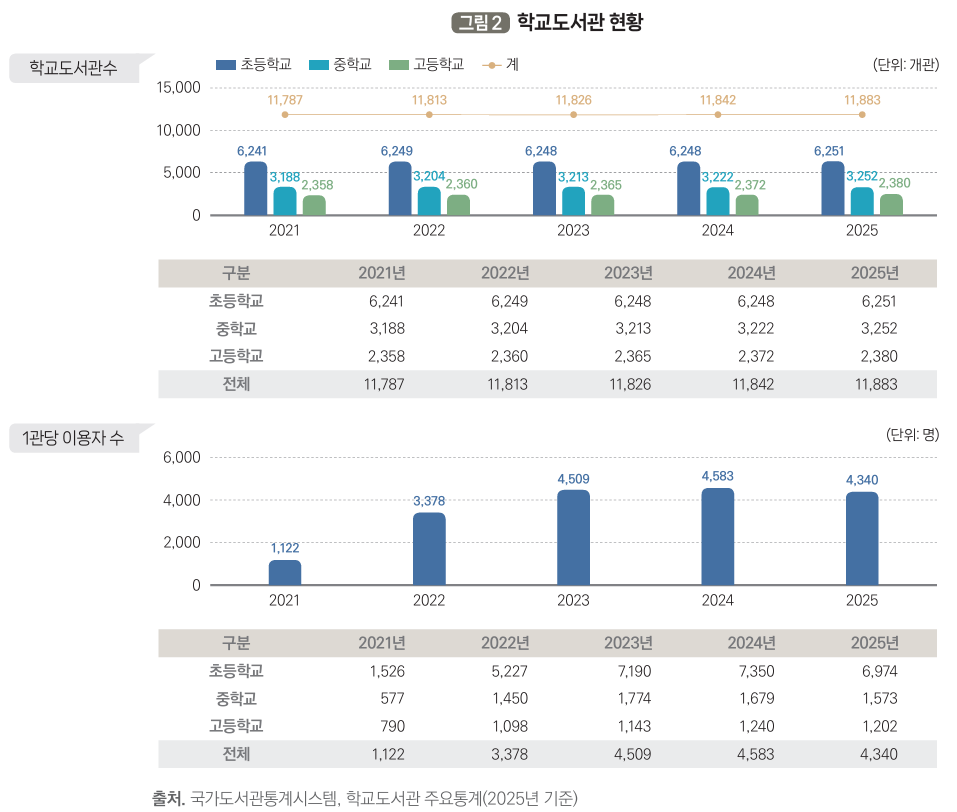 학교도서관 역시 거의 모든 학교에 설치되면서 안정적인 기반을 갖췄다. 2021년 1만1,787개였던 학교도서관은 2025년 1만1,883개로 완만한 증가세를 이어갔다.