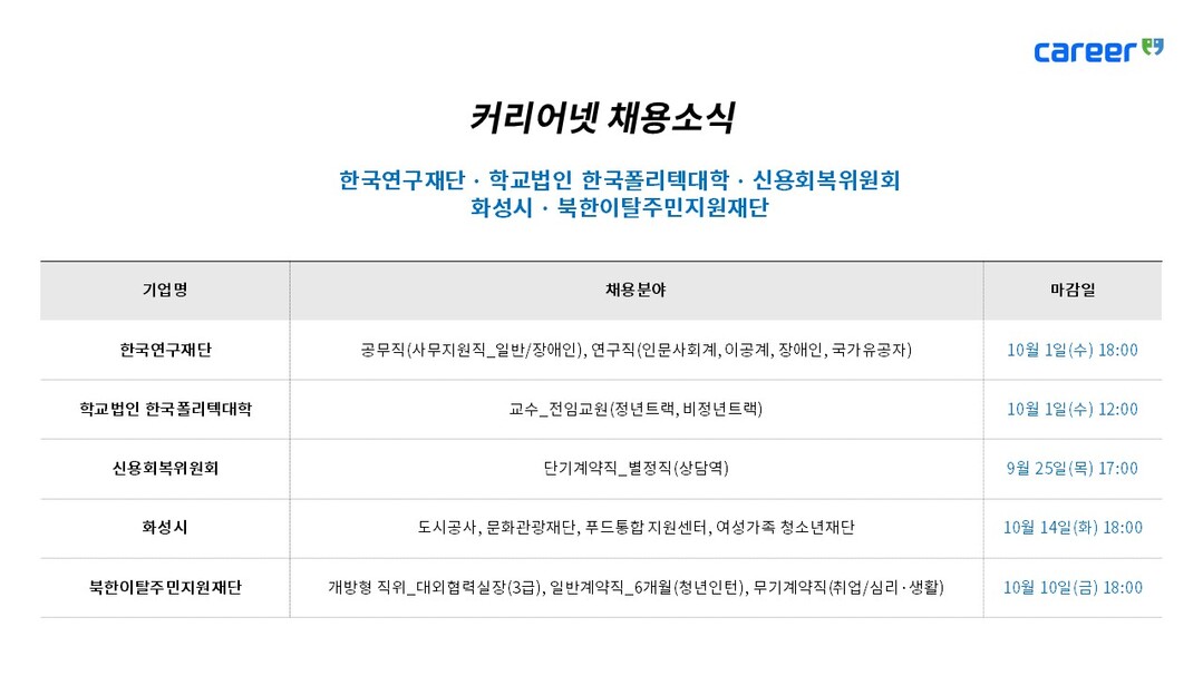 [피앤피뉴스=마성배 기자] 취업 포털 커리어는 23일 한국연구재단, 학교법인 한국폴리텍대학, 신용회복위원회, 화성시 공공기관, 북한이탈주민지원재단의 2025년 하반기 채용 소식을 발표했다.