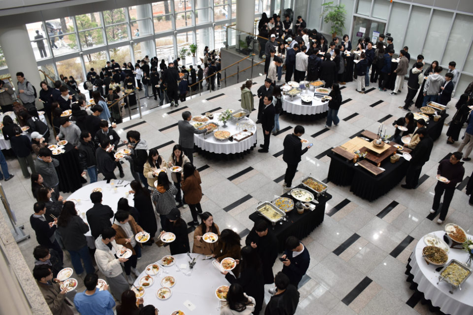 서암관 로비에서 교수·학생·직원 함께한 자유로운 스탠딩 파티