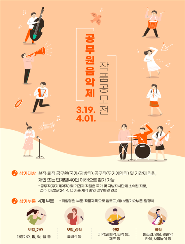 인사혁신처와 공무원연금공단은 3월 19일부터 4월 1일까지 ‘2024년 제18회 공무원 음악제’ 출품 작품 공모한다고 20일 밝혔다.