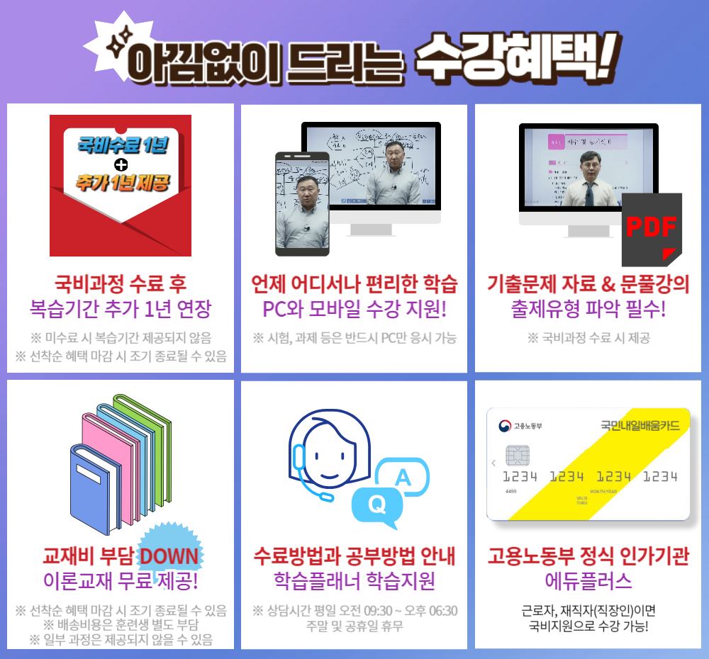 에듀플러스에서는 전문 강사진이 편성한 강의를 국비지원으로 수강할 수 있고, 해당 강사가 직접 집필한 교재로 수업할 수 있어 전문적인 시험대비가 가능하다.