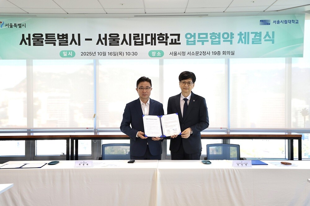 | ▲주용태 서울시 경제실장(왼쪽)과 전인한 서울시립대학교 교학부총장(오른쪽)이 10월 16일 서울시청 서소문2청사에서 「2025 소프트웨어 중심대학 사업 협력」 업무협약(MOU)을 체결하고 기념 촬영을 하고 있다.(출처: 서울시) |