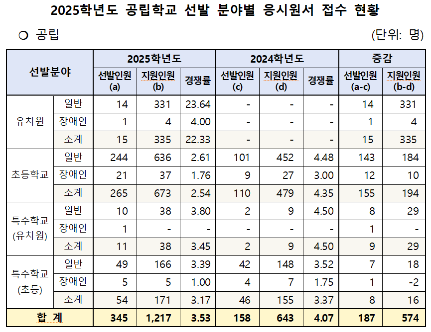 특히 유치원 교사는 22.33:1로 압도적인 경쟁률을 기록하며 치열한 경쟁을 예고했다. 반면 초등학교 교사는 2.54:1, 특수학교(유치원) 교사는 3.45:1, 특수학교(초등) 교사는 3.17:1의 경쟁률을 보이며 상대적으로 낮은 수치를 기록했다.