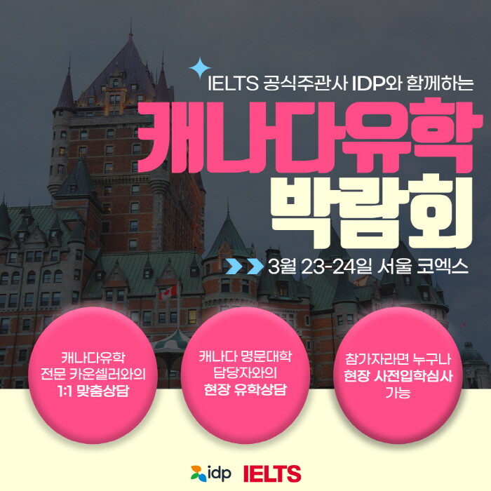 [피앤피뉴스=이수진 기자] 글로벌 교육기업 IDP 에듀케이션이 3월 23일 – 24일 양일간 캐나다 유학상담이 가능한 IDP 캐나다유학박람회를 개최한다고 밝혔다. 관계자는 “글로벌 교육기업 IDP에듀케이션이 캐나다의 주요 대학 학교 담당자를 직접 만날 수 있는 자리를 마련했으며, 인기 공립 컬리지와 대학들을 초대하여 학생들과 학부모님들이 궁금한 부분을 직접 문의할 수 있도록 준비했다”라고 전했다. 더불어 “편입을 위한 컬리지 및 대학예비과정을 제공하는 대학이 참석을 하기 때문에 낮은 내신 또는 검정고시로 인해 명문 4년제로 진학하지 못하는 학생들을 위한 효율적인 유학계획을 세울 수 있을 것”이라고 덧붙였다.