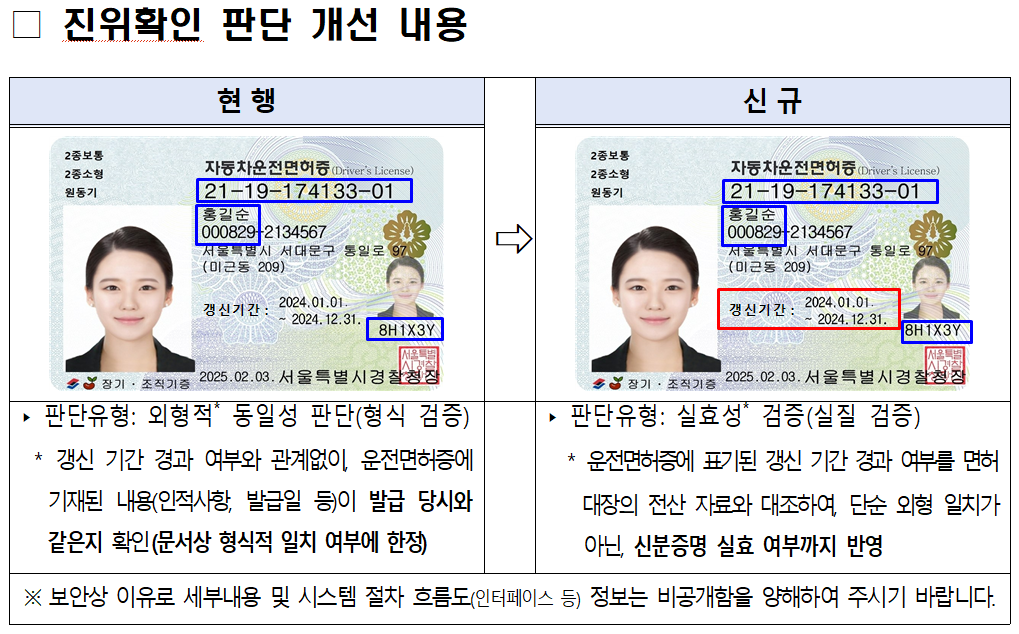 현재 운전면허 진위확인 서비스는 갱신 여부와 상관없이 단순히 면허증 기재 내용이 발급 당시와 같은지만 확인해 ‘일치’로 안내하고 있다. 이 때문에 갱신이 지연된 면허증도 신분증으로 사용 가능해 행정기관·금융기관 현장에서 혼선이 발생해 왔다.