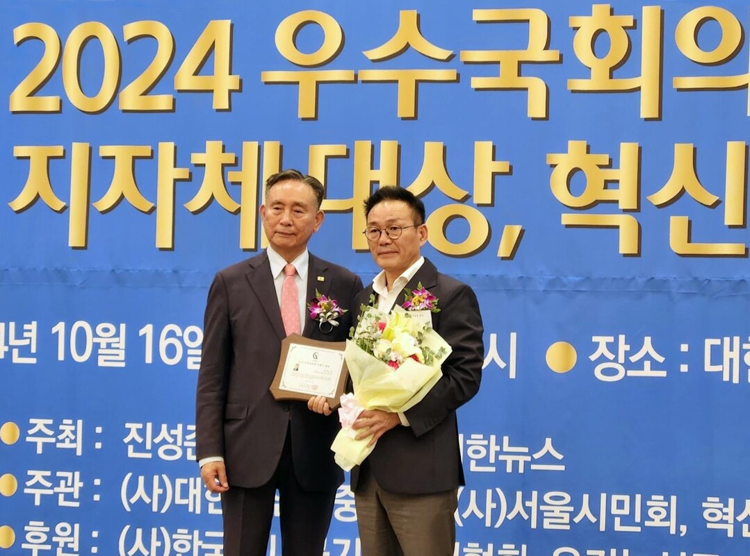 ▲ 박재석 자연속요정 회장(오른쪽)이 박태권(전 충남도지사)로 부터 소비자만족 브랜드 대상을 수상하고 있다.