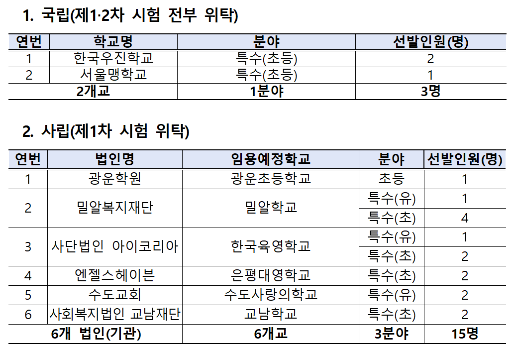 국립학교 교사는 특수학교(초등)에서 3명을 선발하며, 한국우진학교와 서울맹학교에서 요청한 인원이다. 국립학교 시험은 공립과 동일한 절차로 시행된다.