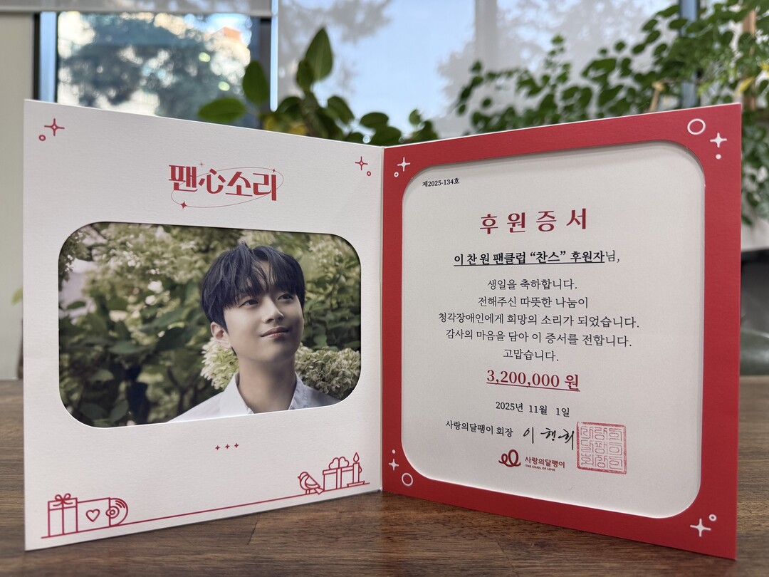 [피앤피뉴스=마성배 기자] 가수 이찬원의 공식 팬클럽 ‘찬스’가 청각장애인 지원을 위해 또 한 번 뜻깊은 나눔을 이어갔다.
