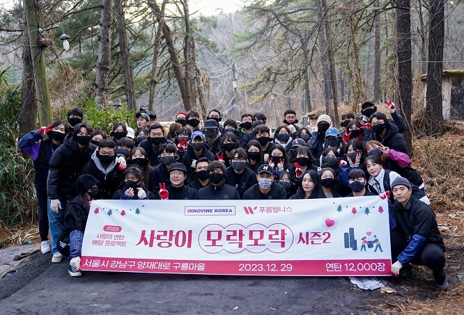 작년 시즌1에 이어 올해도 진행한 ‘사랑이 모락 모락 시즌2’ 캠페인으로 연탄 12,000장이 적립되어 이날 3,000장이 이웃에게 배달되었다. 행사에는 약 60여명의 이노바인코리아 임직원 및 CEO, 연예인봉사단 '멋슬봉사단'이 함께하며 직접 손으로 집집마다 연탄을 배달했다.