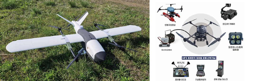 유·무선복합드론은 배터리와 전기의 전력시스템이 하나의 기체에 적용된 유선·무선 복합 드론이다. 평상시에는 전기선으로 전력을 공급받으며 장시간 비행하며, 유사시에는 줄을 탈락하여 무선으로 전환한 다음에 임무를 수행한다. 유선 상태에서도 최대고도 100m에서 작동할 수 있으며, 무선으로 전환할 경우 최소 25분 체공이 가능하다. 이는 육해공 기지 방어용은 물론 긴급 인명수색 및 구조용으로도 활약이 가능하다. 또한 MFS와 함께 활용하여, 다수 무인기를 동시 통제하여 통제 체계 주요 지역 경계 및 수색 정찰, 대침투작전 등 군·경·소방 현행 작전에 활용이 가능하며, 1대로 통신중계, 조명활동, 기지방어 등 다양한 임무에 활용하는 것도 가능하다.