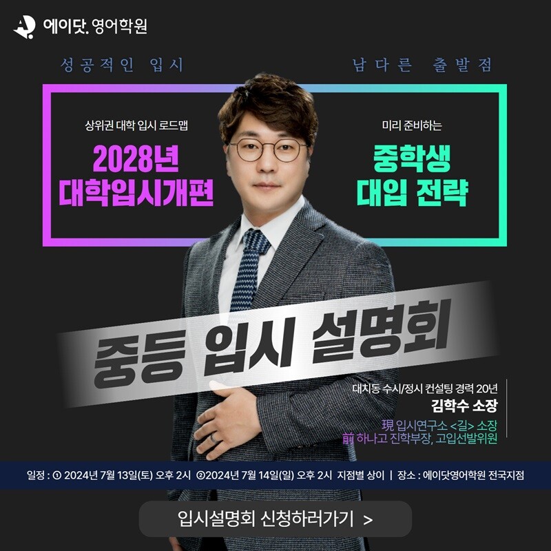 [피앤피뉴스=마성배 기자] 온·오프라인 1:1 프리미엄 영어 교육 브랜드 ‘에이닷 영어학원’과 ‘에이닷온’을 운영하는 ‘디쉐어’가 여름방학을 맞이해 대치동 입시 전문가와 함께 ‘2028년 대입 개편 중학생을 위한 상위권 대학 입시 로드맵’ 설명회를 진행한다.