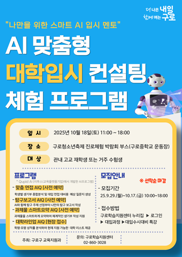 맞춤 면접 AIQ, 탐구보고서 AIP 등 심화 프로그램은 사전접수 필수다. AI가 학생의 생활기록부를 정밀 분석해 나만의 면접 질문지를 제시하고, 선택한 키워드·유형으로 AI가 탐구보고서를 생성해 주는 심화 프로그램이기에, 정확한 서류 확인과 일정·정원 관리를 하기 위함이다. 신청 방법은 9월 29일(월) 오전 10시부터 구로학습지원센터 누리집에서 선착순으로 받고 있으며, 현재 접수 진행 중이다.