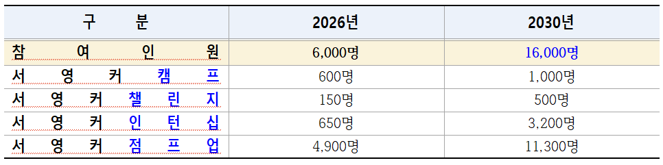 서울시가 추진하는 ‘서울 영커리언스’는 청년(Young)·경력(Career)·경험(Experience)을 결합한 통합 인턴십 플랫폼으로, 재학생 단계부터 실무 역량을 체계적으로 강화할 수 있도록 총 5단계로 구성됐다. 내년 6천 명을 시작으로 2030년에는 1만6천 명 규모까지 확대된다.