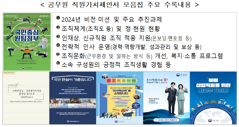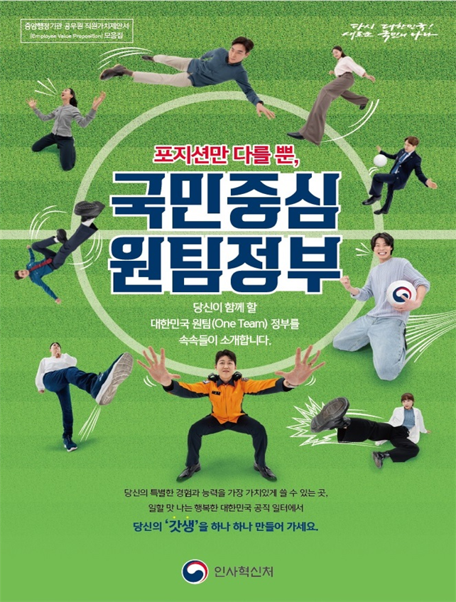 ‘당신이 함께할 대한민국 원팀(One Team) 정부를 속속들이 소개합니다’라는 제목의 이 책자는 각 기관의 인재상, 인사 운영, 조직문화, 경력개발 및 성장 기회, 성과보상 및 복지 등 구직자가 궁금해할 수 있는 내용을 포함하고 있고, 각 기관에서 실시한 소통 프로그램과 공직생활 경험 조사 결과도 담고 있다.