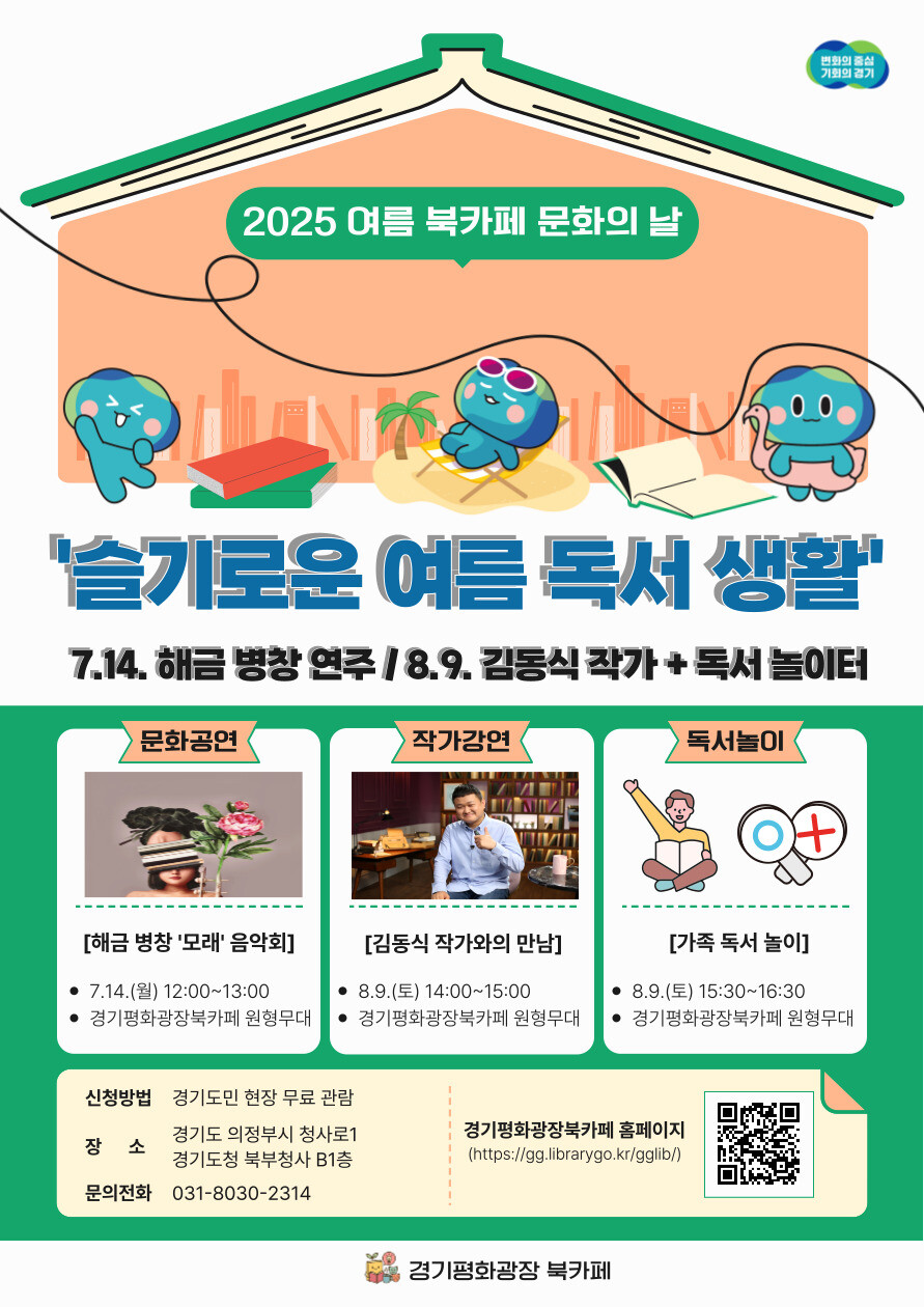 [피앤피뉴스=마성배 기자] 한여름 무더위를 식혀줄 특별한 문화 프로그램이 경기도청 북부청사 경기평화광장 북카페에서 열린다. 경기도는 7월 14일(일)과 8월 9일(금), ‘여름 특집 문화의 날’을 개최해 도민에게 음악과 독서를 즐길 수 있는 이색적인 여름 문화 경험을 선사한다.