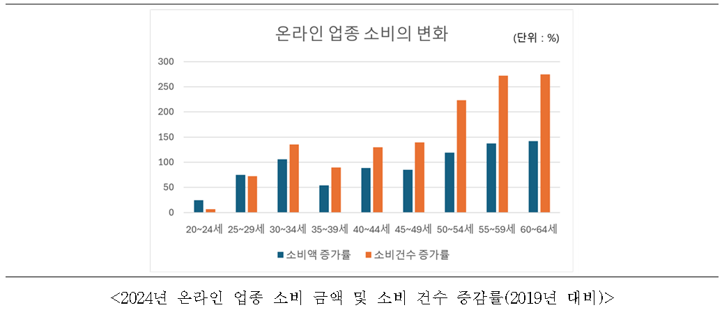 특히 온라인 소비 증가율은 50대 이상에서 폭발적으로 증가했다. 50~54세는 119.2%, 60~64세는 141.7%로, 연령대가 높아질수록 증가 폭이 커졌다. 이는 디지털 환경에서 시니어 세대의 구매력과 적응력이 확장되고 있음을 나타낸다.