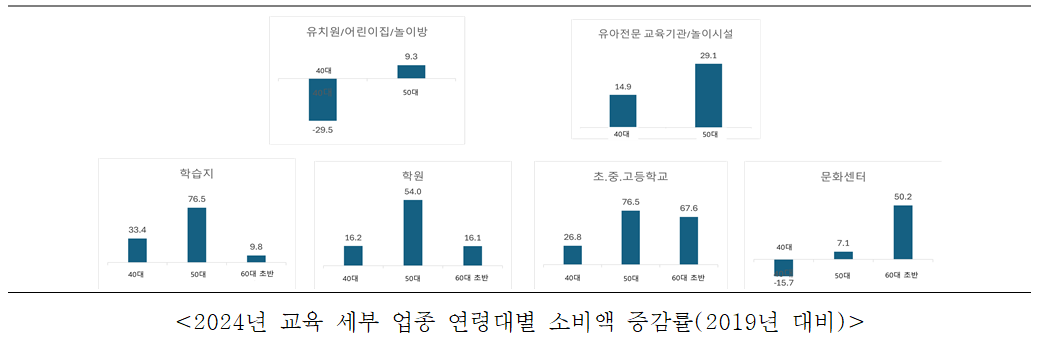 교육 분야에서도 연령대별 차이가 확인됐다. 50대 초반은 자녀 교육비 지출 증가가 두드러졌으며, 학습지와 학원, 초·중·고등학교 관련 소비에서 높은 증가율을 보였다. 이는 출산연령 증가와 저출생 영향으로 인해 50대 초반 학부모의 교육비 부담이 커지고 있음을 보여준다.